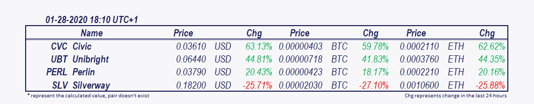 Top movers of the day at 18:10 are Unibright and Perlin. Since 1 pm Unibright has increased by 5.55% and Perlin by 7.55%. Civic has fallen by 8.21%.
