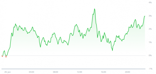In the evening the crypto markets went up again and ended the day much higher. Today’s crypto market movement is illustrated by an adjacent chart showing the movement of the NWSBCT index (Blue Chips) over the past 24 hours. 2100NEWS DA Indexes ended between +0.63% and +3.35%. The coins measured by 2100NEWS DA Coin Index (NWSCo100) ended +2.28%. Non-Ethereum tokens represented by 2100NEWS DA NonEthereum Based Index (NWSOT50) ended +1.33%. Our main 2100NEWS Digital Assets Total Index (NWST1100) ended +2.44%. Bitcoin and Ether also ended the day higher: BTC +2.72%, ETH +2.18%.
