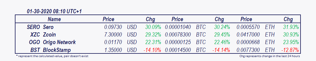 Top movers of the day are Sero and Origo Network which has soared 19.02% since midnight. Sero has increased by 8.38% and Zcoin by 5.87%.