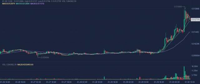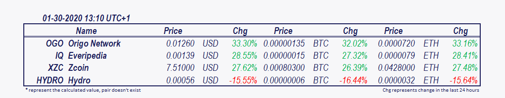 Top mover of the day at 13:10 is Origo Network which has surged 9.07% since morning. Everipedia has increased by 1.74% and Zcoin by 3.01%.