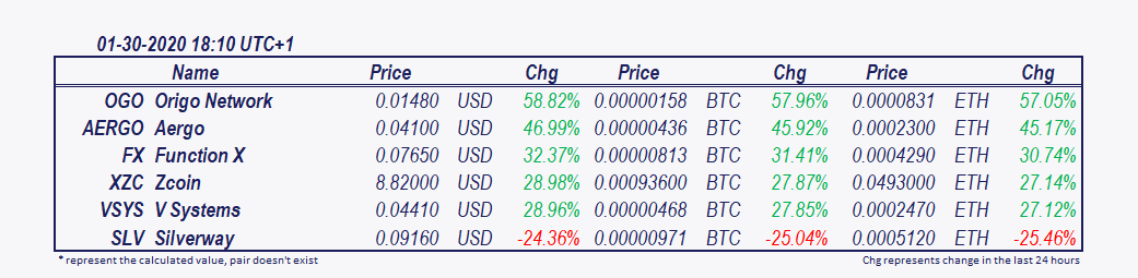 Top movers of the day at 18:10 are Function X and V Systems. Since 1 pm Function X has soared 23.65% and V Systems 24.82%. Origo Network has increased by 15.46%, Aergo by 17.31% and Zcoin by 17.42%.