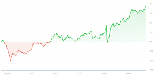 In the evening the crypto markets continued to go up and ended the day much higher. Today’s crypto market movement is illustrated by an adjacent chart showing the movement of the NWSBCT index (Blue Chips) over the past 24 hours. 2100NEWS DA Indexes ended between +2.07% and 4.34% (NWSCo100). 2100NEWS DA Ethereum Based Index (NWSET100) which measures the performance of tokens based on Ethereum ended +2.35%. Our main 2100NEWS Digital Assets Total Index (NWST1100) ended +3.15%. Bitcoin and Ether also ended the day much higher: BTC +2.36%, ETH +5.85%.