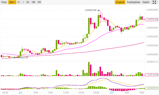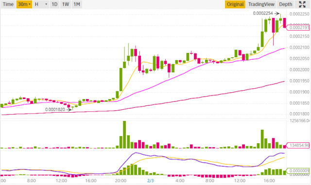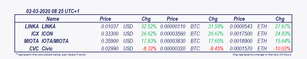 Top movers of the day are LINKA and ICON. Since midnight LINKA has increased by 2.58% and ICON by 7.67%. IOTA has surged 14.40%.