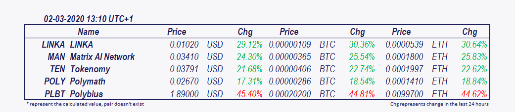 Top movers of the day at 13:10 are LINKA and Matrix AI Network. Since morning LINKA has increased by 2.91% and Matrix AI Network by 8.23%. Polymath is 7.01%  higher.