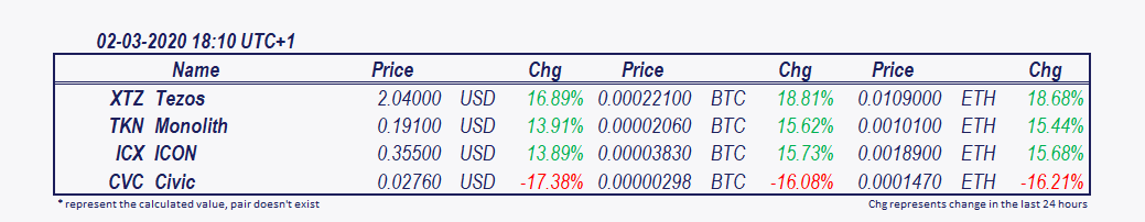 Top movers of the day at 18:10 are Tezos and Monolith. Since 1 pm Tezos has increased by 7.87% and Monolith by 9.43%. ICON is 9.06% higher.