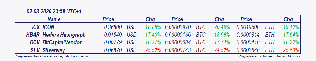 Top movers of the day are ICON and Hedera Hashgraph. Since 6 pm ICON has increased by 3.02% and Hedera Hashgraph by 5.18%. BitCapitalVendor is 4.05% higher.