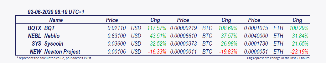 Top movers of the day are BQT and Neblio. Since midnight BQT has soared 68.50% and Neblio 5.75%. Syscoin has increased by 21.69%.