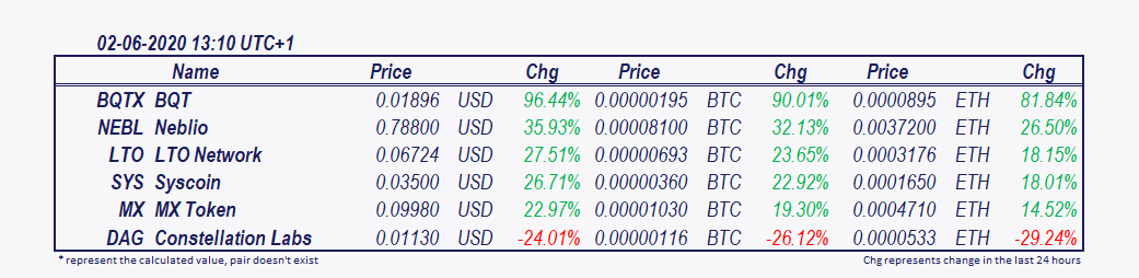 Top mover of the ay at 13:10 is LTO Network which has soared 19.16% since morning. MX Token has increased by 8.27%. BQT and Neblio are lower: BQTX -12.69%, NEBL -4.69%.