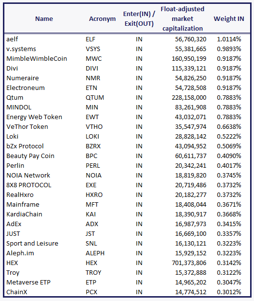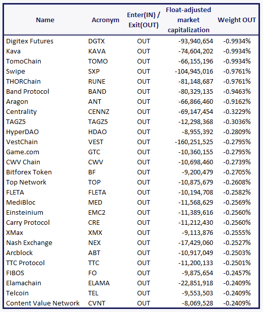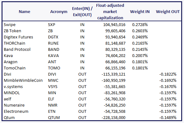 The Bi-weekly revision update both, the amount of each asset publicly available and any additions and deletions from the indexes. On the tables below there are additions and deletions from NWS30, NWSL100, and NWSM200. As we can see on the tables Swipe, ZB Token, Digitex Futures, … have improved their rankings they were added to NWSL100, they were deleted from NWSM200. Divi, MimbleWimble Coin, v.systems, … were deleted from NWSL100, they are new members of NWSM200. New mid-caps are Energy Web Token, VeThor Token, Loki … Other additions and deletions this week for the other indexes from the family are available in each index presentation.