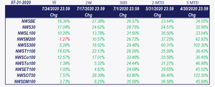The total (NWST1100) index soared 14.62%. On the table above we can see, that Bitcoin and Ether represented by the NWSBE have led the way up.