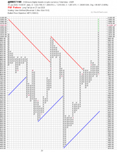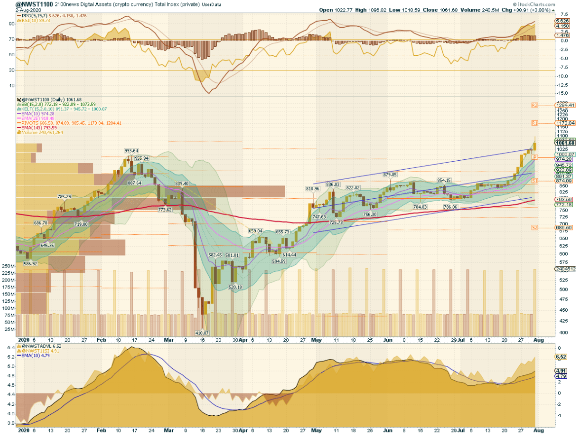 *We gauge the crypto market breadth and direction of the market by showing charts 2100NEWS Digital Assets Total Index (NWST1100) which represents the top 1100 Digital Assets. The information-laden chart is difficult to read at first glance but the chart shows key price information, important decisive price levels, momentum, trading volumes, and crypto market breadth.