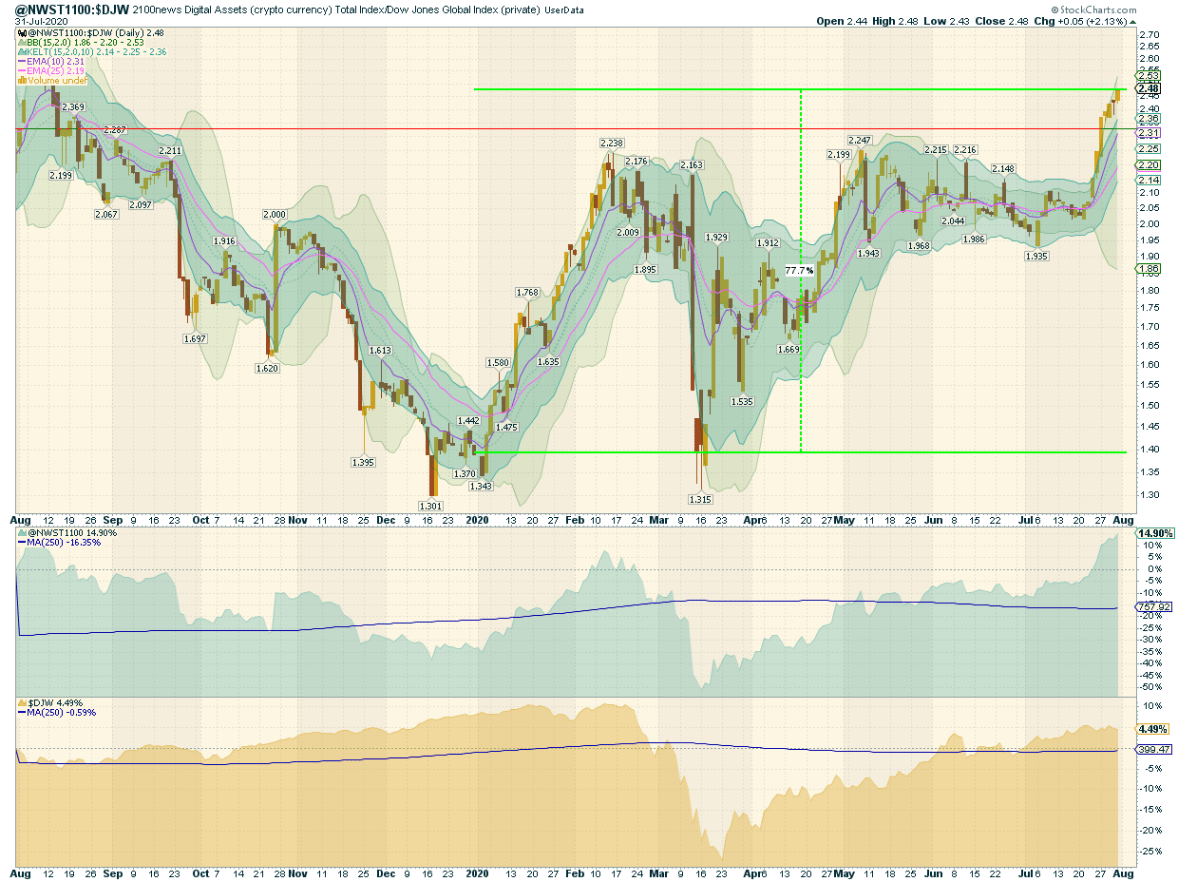 The chart below compares the performance of the average represented by our NWST1100 Digital Asset index with the average global share represented by Dow Jones global W1Dow index. This year after investors digested the havoc caused by the coronavirus pandemic the NWST1100 outperformed W1Dow by 78%.  Over the last 12 months, NWST1100 was 6.5% higher. The box in the middle of the chart shows the original NWST1100 price, at the bottom of the chart is W1Dow. The blue curve is the average index price over the last twelve months. We can see that the NWST1100 price and W1Dow price are above average, but the NWST1000 spot price average is 37% higher than twelve months index average price.
