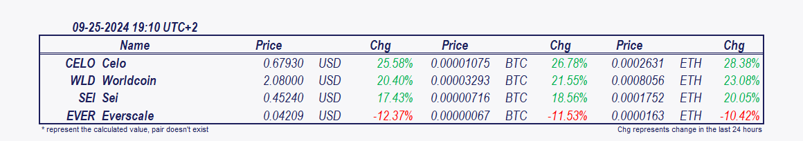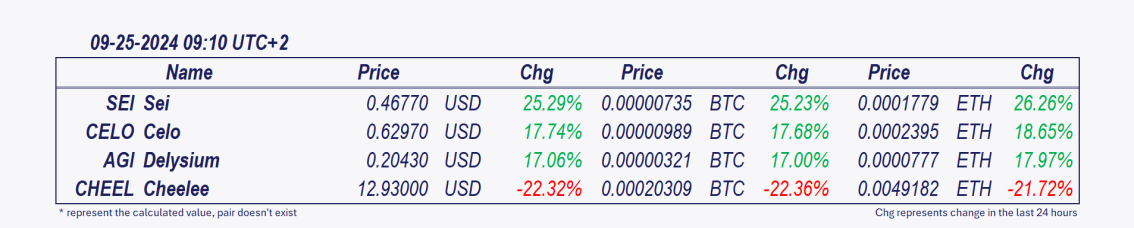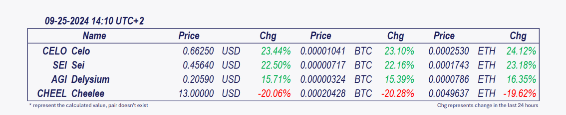 • Sei and Celo: These cryptocurrencies have grown remarkably over the past 24 hours,  Celo increasing by 7.68% since the morning update.