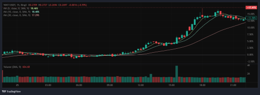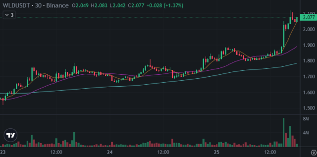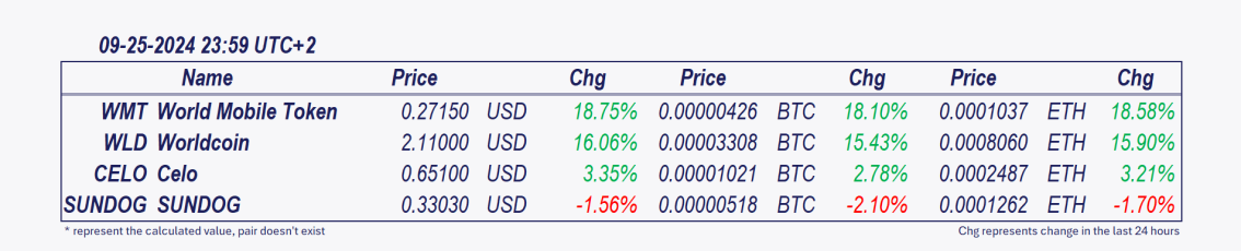 • World Mobile Token and Worldcoin: These cryptocurrencies have grown remarkably over the past day, with World Mobile Token increasing by 8.62% since 7 p.m.