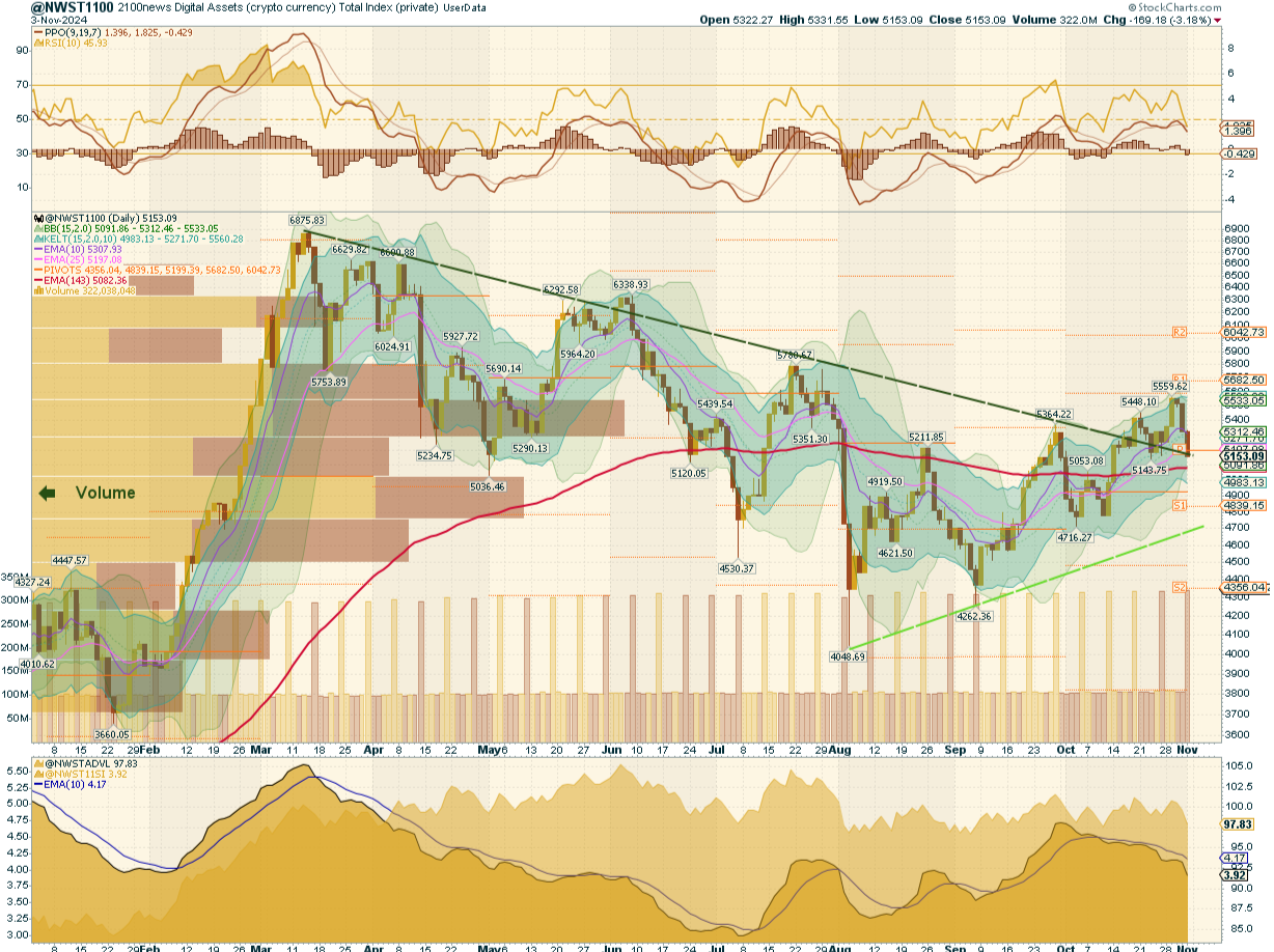 *Below, we present a standardized weekly report and next week’s outlook, prepared based on the Theory Swingtum of intelligent finance. We gauge the crypto market’s breadth and direction by showing charts 2100NEWS Digital Assets Total Index (NWST1100), which measures 1100 (by market capitalization) significant crypto assets’ performance. The information-laden chart is complex to read initially, but the graph shows essential price information, crucial decisive price levels, momentum, trading volumes, and crypto market breadth. Monitoring Market Sentiment and Breadth is necessary to detect early signs of trend reversals or continued strength.