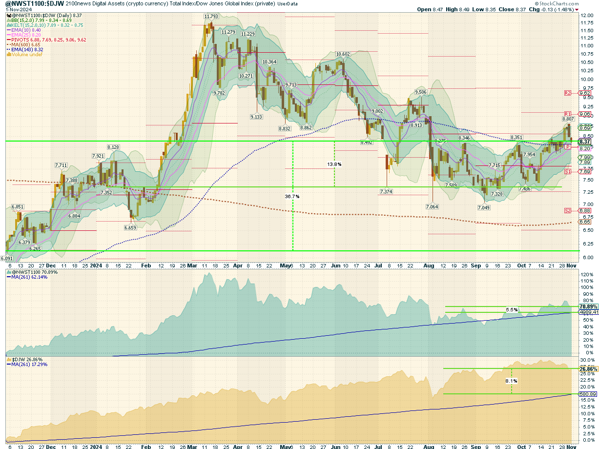 This report offers a comprehensive analysis comparing the performance of digital assets, as signified by the NWST1100 index, to shares on global capital markets, as represented by the Dow Jones Global W1Dow index. The comparison spans various timeframes, offering insights into historical and recent performances and potential future trends.
