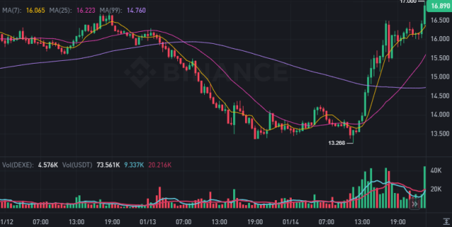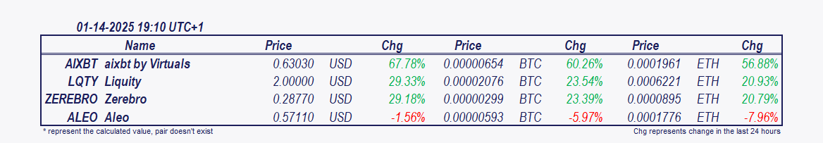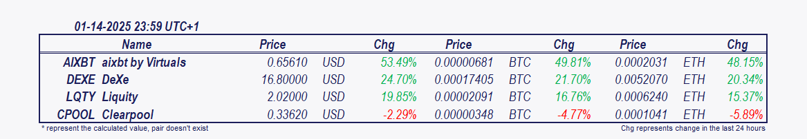 Top movers of the day are aixbt by Virtuals and DeXe. Since 7 pm aixbt by Virtuals has increased by 4.33%, DeXe by 4.90%. Liquity is 0.13% higher.