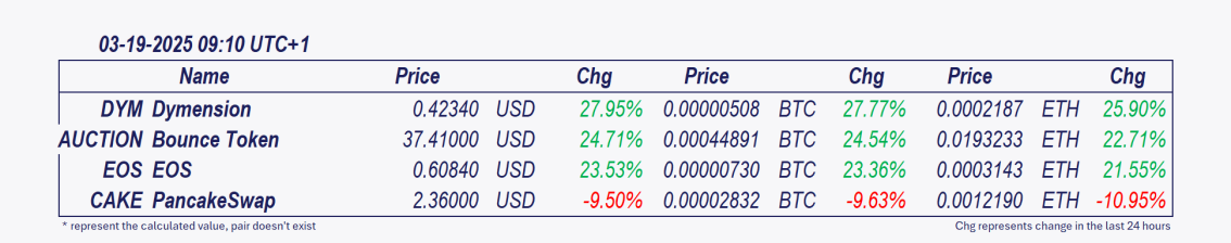 • Dymension and Bounce Token: These cryptocurrencies have grown remarkably over the past 24 hours.