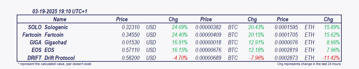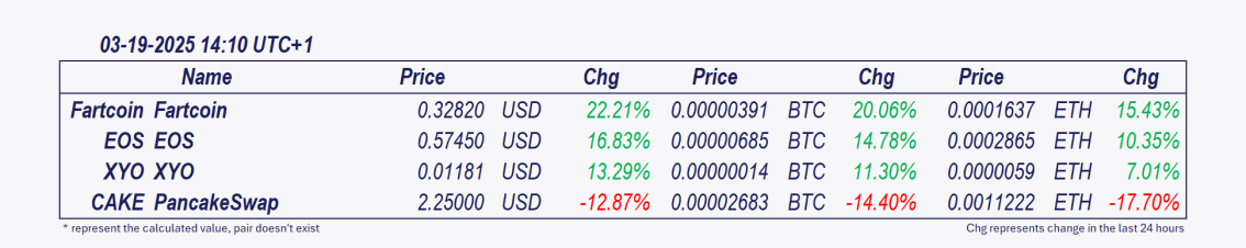 • Fartcoin and EOS: These cryptocurrencies have grown remarkably over the past 24 hours.