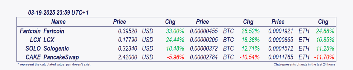 • Fartcoin and LCX: These cryptocurrencies have grown remarkably over the past day, with LCX surging by 22.18% since 7 p.m.