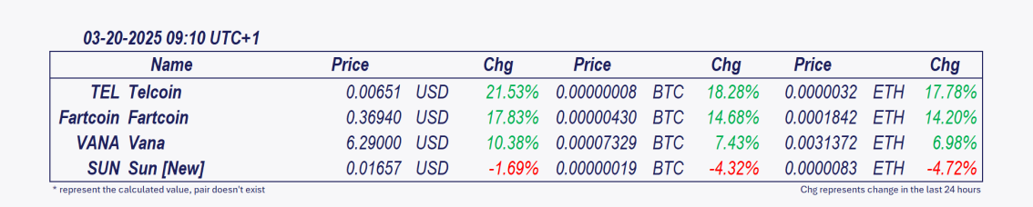 • Telcoin and Fartcoin: These cryptocurrencies have grown remarkably over the past 24 hours.