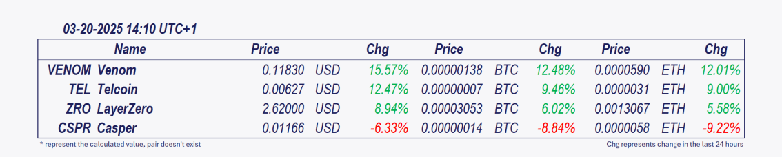 • Venom and Telcoin: These cryptocurrencies have grown remarkably over the past 24 hours.