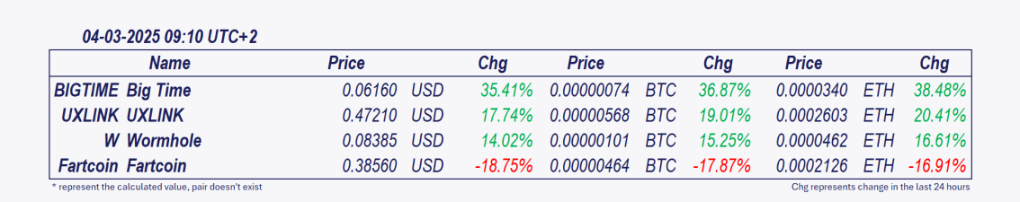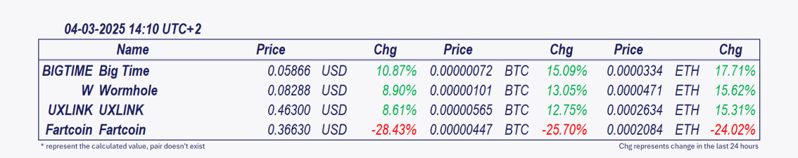- Big Time and Wormhole: These cryptocurrencies have grown remarkably over the past 24 hours.