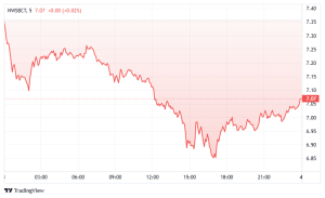 - NWSBCT Index for Blue Chips: Focusing on the more established cryptocurrencies, colloquially known as the “Blue Chips”. The index fell steadily through the afternoon, briefly stabilizing near 6.90 before recovering modestly to 6.96 by 19:00 CET. 🧭 Market structure is firmly bearish with no confirmed reversal; the next support lies around 6.85, while resistance looms near 7.10.