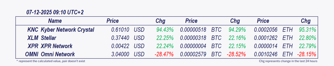 - Kyber Network Crystal v2 and Stellar: These cryptocurrencies have been the best performers over the past 24 hours, with Kyber Network Crystal v2 delivering the most substantial intraday gain since midnight, leaping by 110.20%. đĄ KNCâs rally is fueled by the Arbitrum incentive programâs timing and technical breakout, though overbought RSI signals caution. Will trading volume sustain after the initial campaign hype?