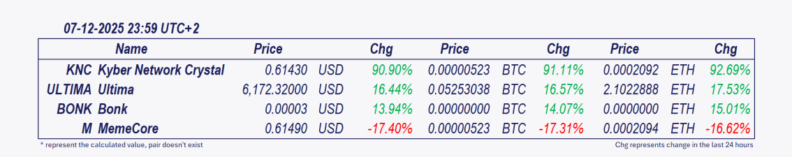 - Kyber Network Crystal v2 and Ultima: These cryptocurrencies have delivered explosive performances over the past day.