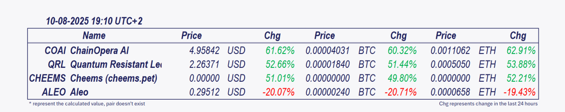 - ChainOpera AI and Quantum Resistant Ledger: These cryptocurrencies have grown remarkably over the past 24 hours.
