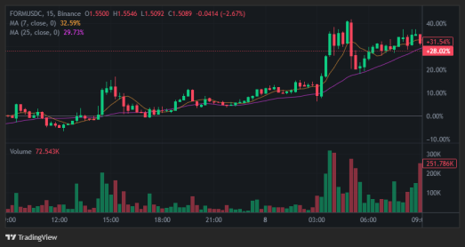 - ChainOpera AI and Four: These cryptocurrencies have been the best performers over the past 24 hours, with Four delivering the most substantial intraday gain since midnight, surging by 24.67%. đĄFORMâs rally combines a liquidity-driven short squeeze, technical breakout triggers, and renewed RWA sector optimism. While bullish momentum remains dominant, thin liquidity and elevated leverage (open interest +23% MoM) amplify the risk of sharp reversals. Key watch: Can FORM hold above $1.61 (Fib resistance) to confirm a breakout, or will profit-taking erase gains? Monitor funding rates and open interest for early reversal signals.