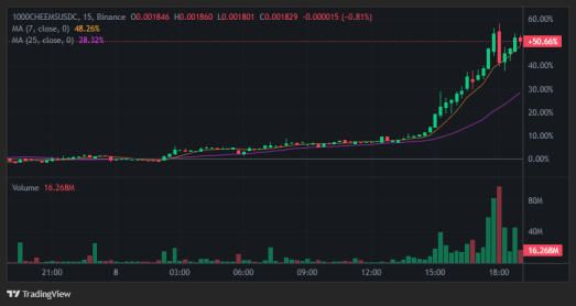 - CHEEMS has soared 38.11% since 2 p.m. đĄCHEEMSâ rally appears driven by technical traders exploiting low-float volatility, amplified by meme-driven retail participation. While momentum indicators still leave room for upside, the lack of new catalysts and extreme turnover (13.3%) increases the risk of a near-term pullback. Key watch: Can CHEEMS hold above $0.0000012479 (23.6% Fib) to confirm continuation, or will profit-taking erase gains?
