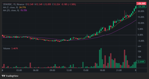 - Horizen has risen by 17.32% since the 7 p.m. update, leading late-session gains. đĄZENâs rally reflects a combination of sector-wide tailwinds for privacy coins, utility-driven demand from ZENDEX, and strong technical momentum. The 30-day gain of +66% underscores improving fundamentals; however, traders should monitor whether ZENDEX adoption continues to sustain trading volume. Key watch: Can ZEN hold above its 200-day EMA ($9.28) amid potential profit-taking pressure?
