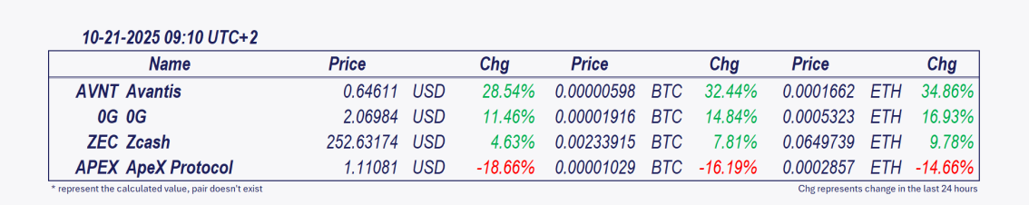 • Avantis and 0G: These cryptocurrencies have been the best performers over the past 24 hours, with 0G posting the most significant intraday gain since midnight, increasing by 7.26%. 💡 0G’s rally reflects a combination of strategic accumulation, yield-driven demand, and short-term technical strength. However, the sustainability of this move depends on AI product rollouts and the management of upcoming token unlocks. Key watch: Can 0G defend the $2.00 level if Bitcoin dominance (+59%) continues rising? Monitor the AI Alignment Node activation timeline for growing network utility and investor confidence signals.