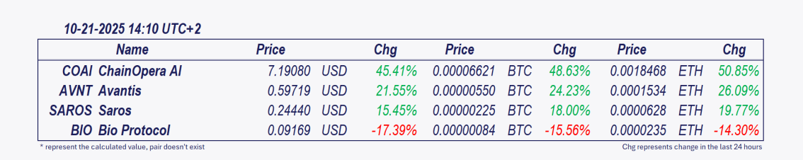 • ChainOpera AI and Avantis: These cryptocurrencies have experienced significant growth over the past 24 hours, with ChainOpera AI surging by 22.75% since the morning update. 💡 COAI’s rally stems from sector rotation, liquidation-driven short covering, and technical mean reversion following heavy drawdowns. While AI narratives and short-term liquidity inflows support upside momentum, on-chain risks remain elevated. Recent Bubblemaps findings revealed $13M in profits by linked wallets, suggesting coordinated trading activity, while only 18.8% of supply is circulating, amplifying volatility. Key watch: Can COAI maintain support above $7.50 to preserve its rebound structure, or will profit-taking from early wallets (over 55M tokens moved to exchanges last week) pressure prices lower?