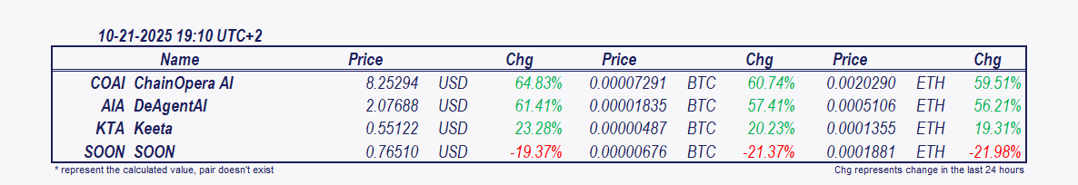 • DeAgentAI and Keeta: Since 2 pm DeAgentAI has surged 52.72%, Keeta is 26.37% higher.