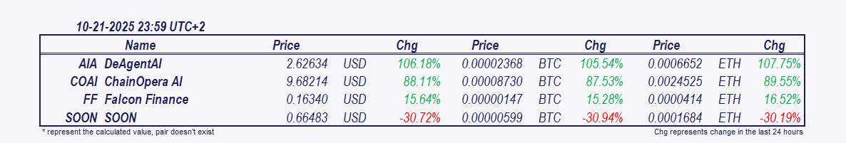 • DeAgentAI and ChainOpera AI: Since 7 pm DeAgentAI has surged 26.46%, ChainOpera AI is 17.32% higher.