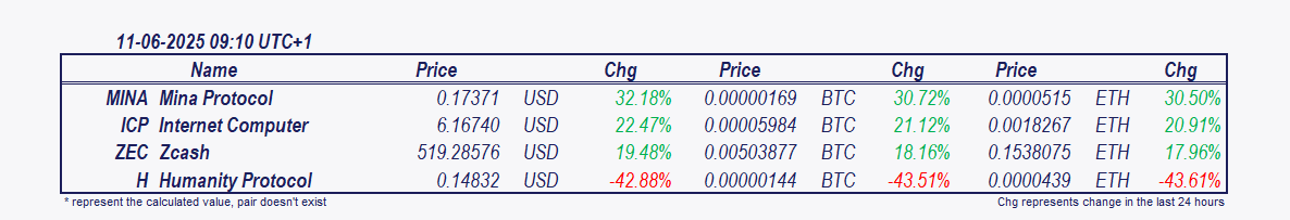 • Mina Protocol and Zcash: Since midnight Mina Protocol has increased by 12.90%, Zcash by 6.80%.