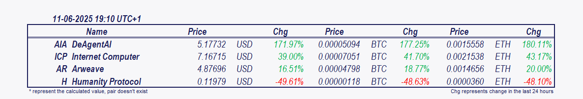 • DeAgentAI and Arweave: Since 2 pm DeAgentAI has surged 55.32%, Arweave is 14.60% higher.