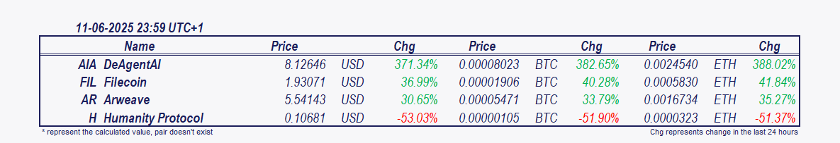• DeAgentAI and Filecoin: Since 7 pm DeAgentAI has surged 56.96%, Filecoin is 26.05% higher.