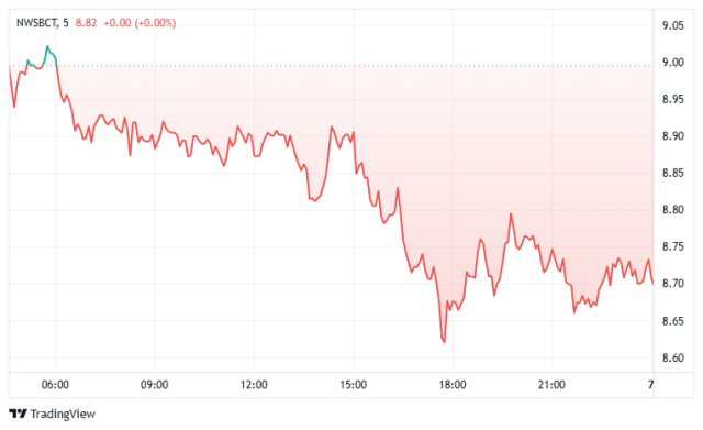 Overview: The NWSBCT index has experienced a sharp and consistent downturn since midday, dropping significantly from levels around 8.95 to below 8.70. After a period of stability, selling pressure intensified, indicating a clear bearish trend across the market.