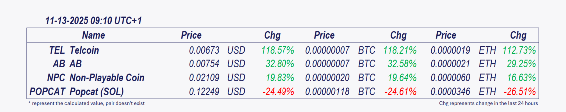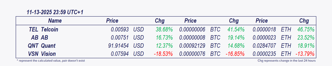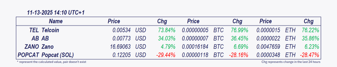 - Telcoin and AB: These cryptocurrencies have been the best performers over the past 24 hours, with Telcoin  posting the most significant intraday gain since midnight, soaring 56.01%. đĄ Telcoinâs price surge reflects a rare trifecta: regulatory clarity, technical confirmation, and sector-specific demand. The approval of its digital asset bank could set a precedent for blockchain integration into traditional finance, though volatility risks remain amid overbought conditions. Key watch: Adoption metrics for eUSD and Telcoinâs ability to onboard U.S. banks onto its platform in Q1 2026.