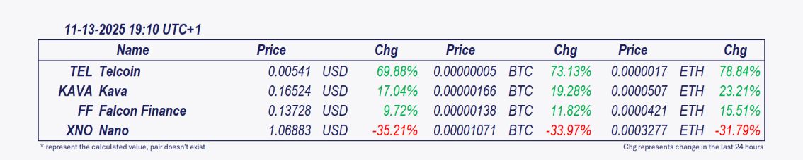 - Telcoin and Kava: These cryptocurrencies have seen remarkable growth over the past 24 hours, with Kava rising by 13.00% since 2 p.m. đĄKAVAâs rally combines technical momentum, AI product adoption, and speculative trading â but faces overhead resistance near $0.16. Key watch: Can KAVA hold above $0.15 if Bitcoin dominance (59.6%) continues rising? Monitor BNB Chain adoption metrics and MACD sustainability for confirmation.