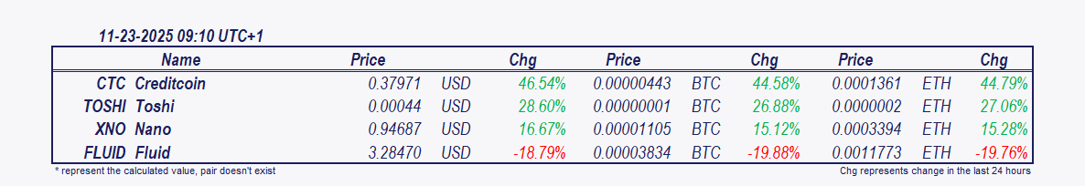 • Creditcoin and Toshi: Since midnight Creditcoin has surged 48.07%, Toshi is 24.78% higher.