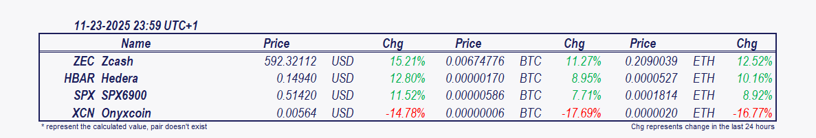 • Zcash and Hedera which has increased by 10.97% since morning. Zcash is 4.63% higher.