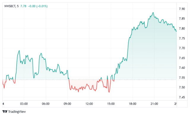 NWSBCT (Blue Chips Index): The NWSBCT index initially experienced a dip after some sideways movement in the early morning. However, it underwent a dramatic reversal in the afternoon, surging strongly upwards to new highs above 7.80. This indicates a powerful resurgence of bullish sentiment and significant buying pressure after a period of consolidation and slight decline.