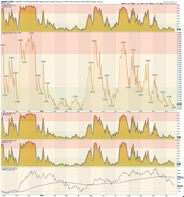 According to the chart on the right, across all major segments (NWST1100, NWSET100, NWSL100, NWSCo100), A50R readings — the share of assets trading above their 50-day EMAs — have dropped to capitulation levels from 8% to 10%, indicating broad market capitulation. Ethereum Tokens (NWSET100) cohort remains the weakest, with only 8% of its constituents above their 50-day averages. Overall, the breadth structure signals deep capitulation, potentially preceding early stabilization rather than continued correction.