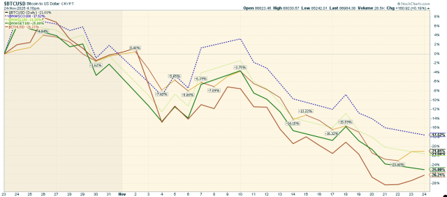 • The chart also presents the returns achieved by the simplified index-based accumulation approach—buying one index point per day over 12 months—to simulate a mechanical exposure build-up. While this method is not equivalent to classical dollar-cost averaging (which involves investing a fixed amount of capital daily), it provides a consistent benchmark for comparing historical costs and returns. The NWST1100 Crypto Index has dropped by 22.19% over the past twelve months. With daily index investments, an investor’s stock price would have resulted in a 20.5% loss from the current index price, because of unprofitable purchases at high entry prices during a prolonged market uptrend when prices remained above the 143-day moving average for an extended period.