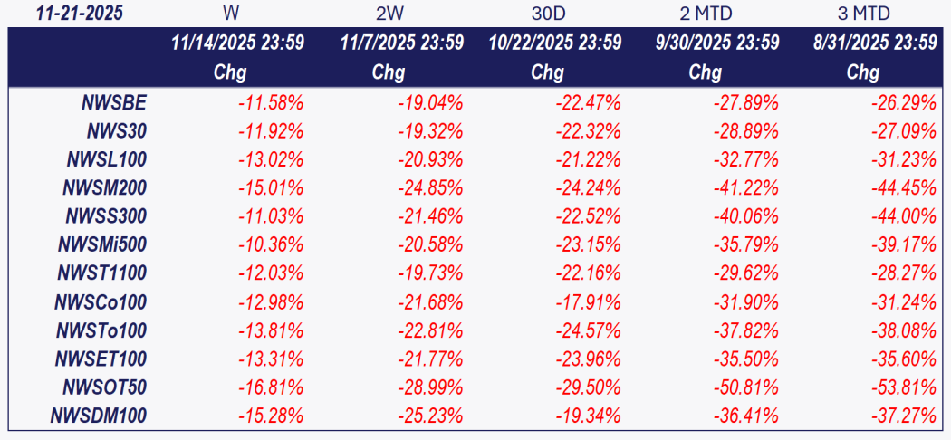 The NWST1100 index declined 12.03%, continuing its descent within a well-defined descending channel. The pattern across all timeframes shows repeated failures at mid-channel resistance and Fibonacci retracement levels, confirming persistent distribution pressure. Each intraday rally failed to sustain momentum — on November 21, the index reached a new local low near 5,788, approaching the lower boundary of the three-week channel.